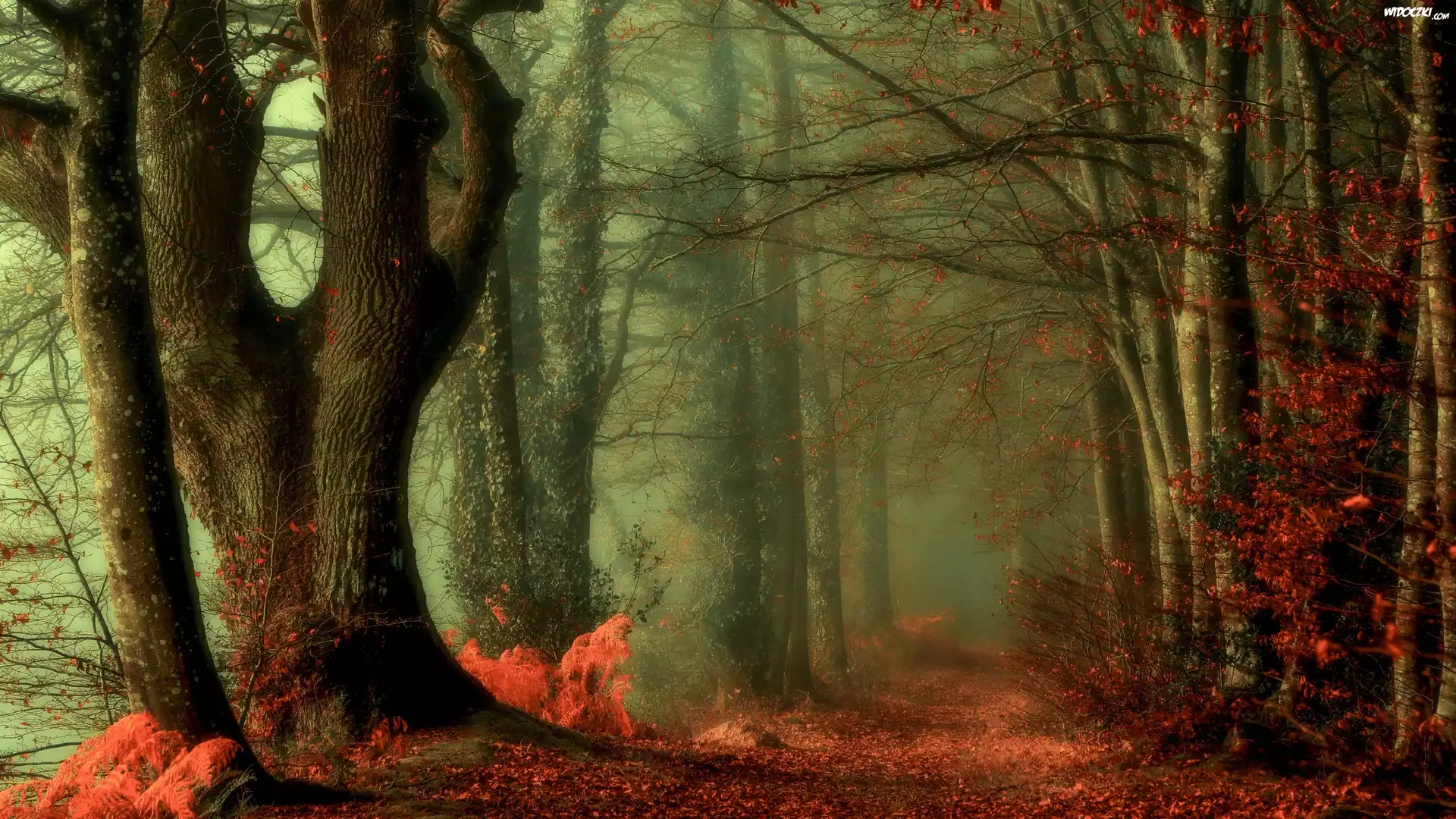 Zdjęcia, Jesień, Las, Droga, Drzewa, Liście, Mgła