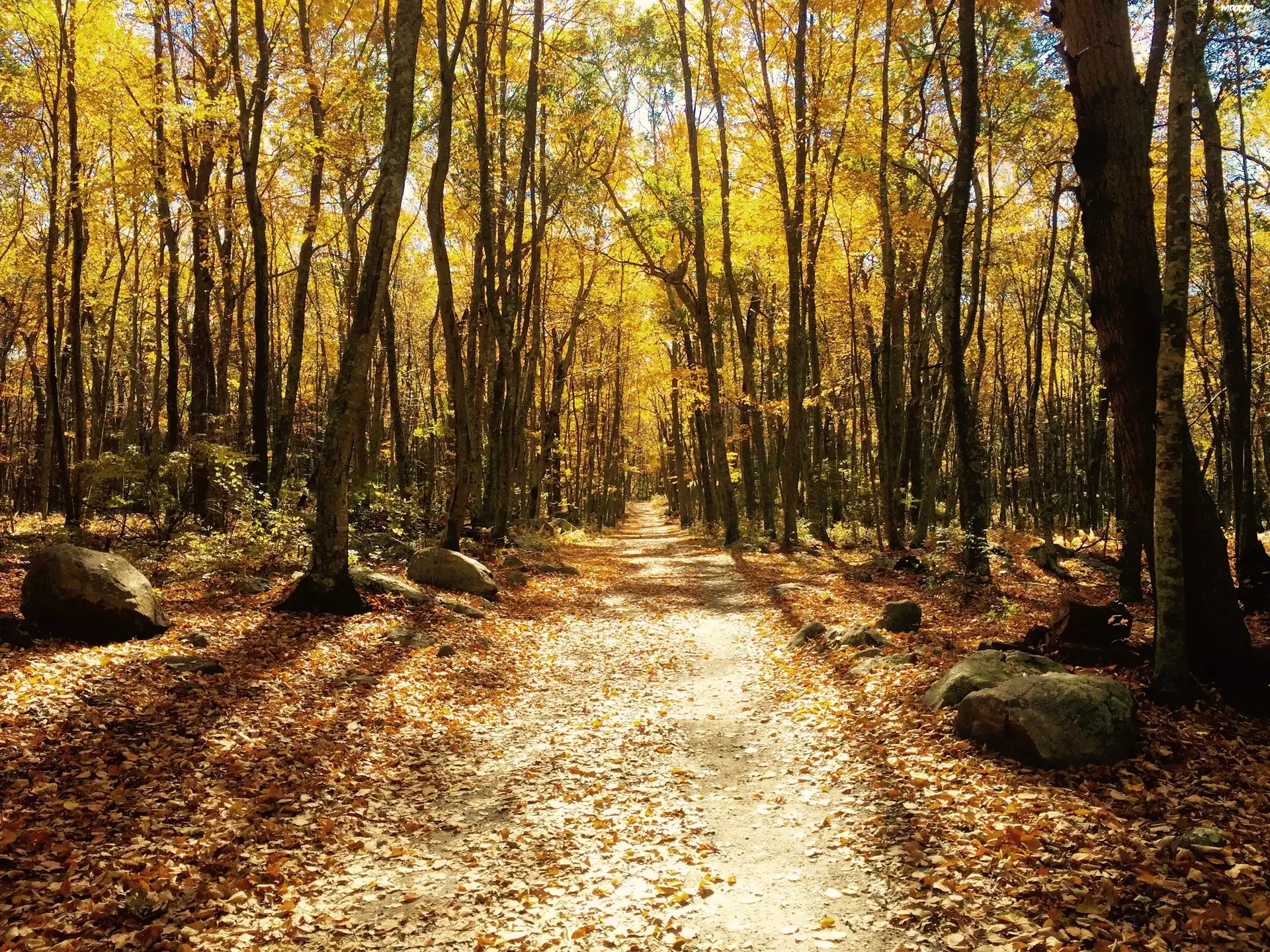 Zdjęcia, Jesień, Las, Drzewa, Liście, Ścieżka