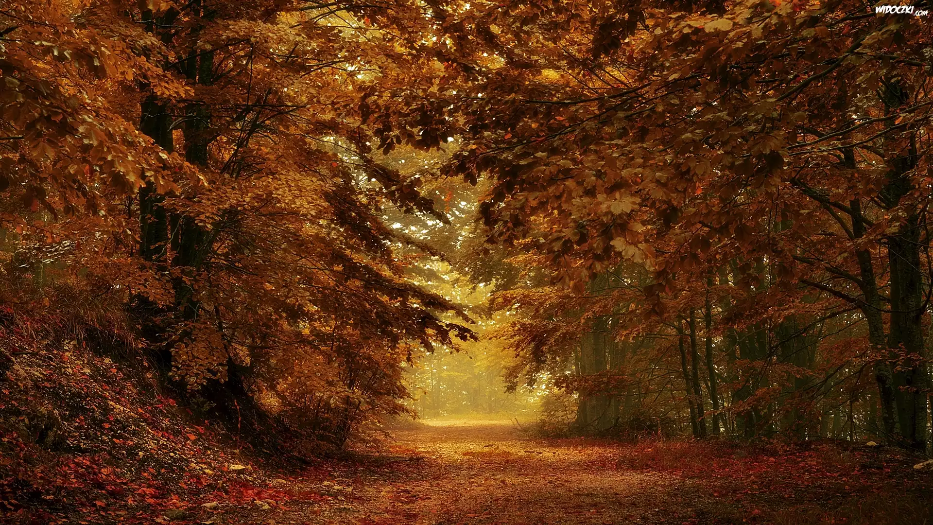 Zdjęcia, Jesień, Las, Drzewa, Liście, Droga