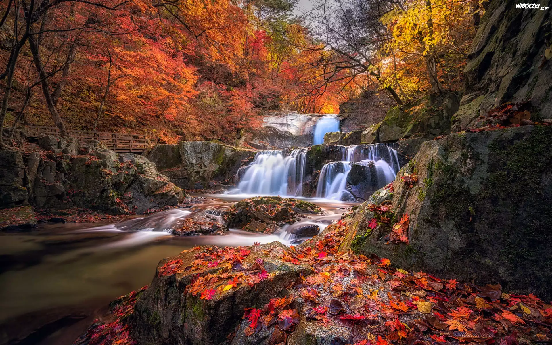Drewniany Most, rzeczka, Jesień Droga, Liście, Jesień Rzeki, Las Wodospad w lesie Wodospad Wodospad, Skały, Konary, Drzew Wodospad Góra, Rzeki Niedźwiedź, Rzeka Las, Żółte, Liście, Słońce Choinki, Zima, Rzeka Wodospad Kalifornia, Niebo, Chmura, Fale, Skała Skała