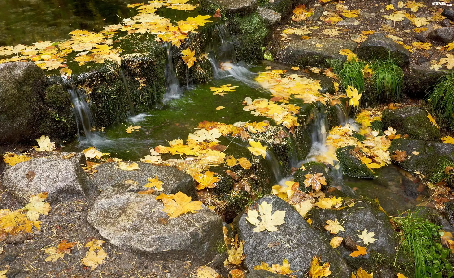 Zdjęcia, Jesień, Kaskada, Liście, Kamienie