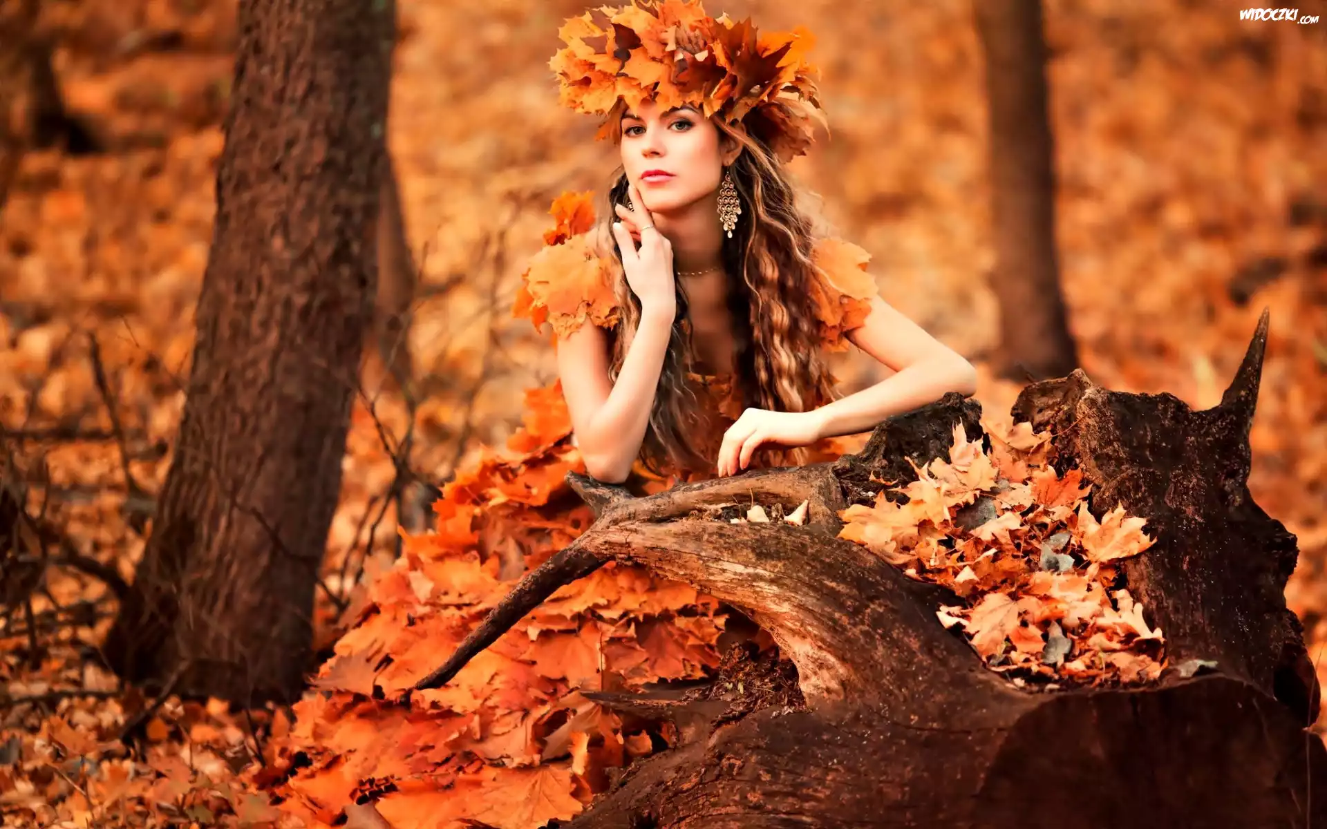 Zdjęcia, Jesień, Park, Kobieta, Liście, Wianek
