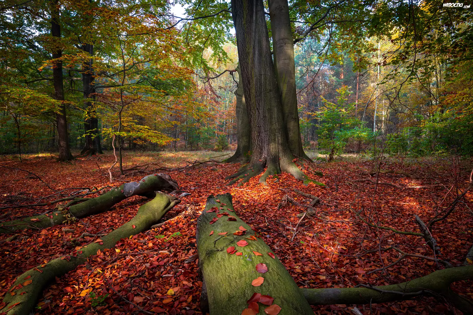 Zdjęcia, Jesień, Drzewa, Opadłe, Liście, Las