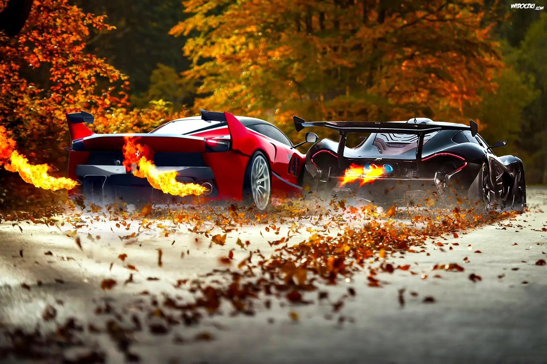 Jesień, Droga, Samochody, Ogień, Liście, Drzewa