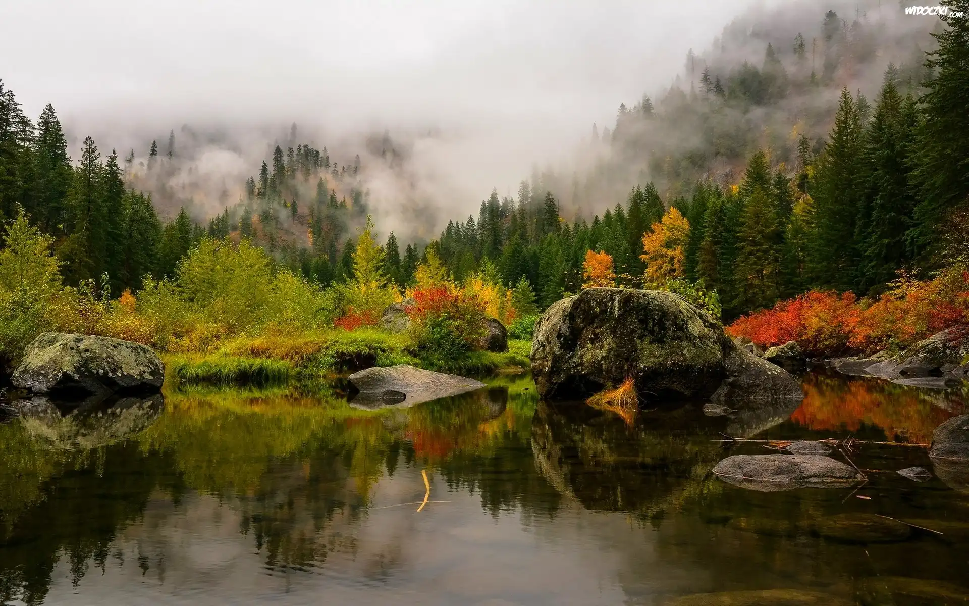 Jesień, Jezioro, Las, Mgła, Kamienie