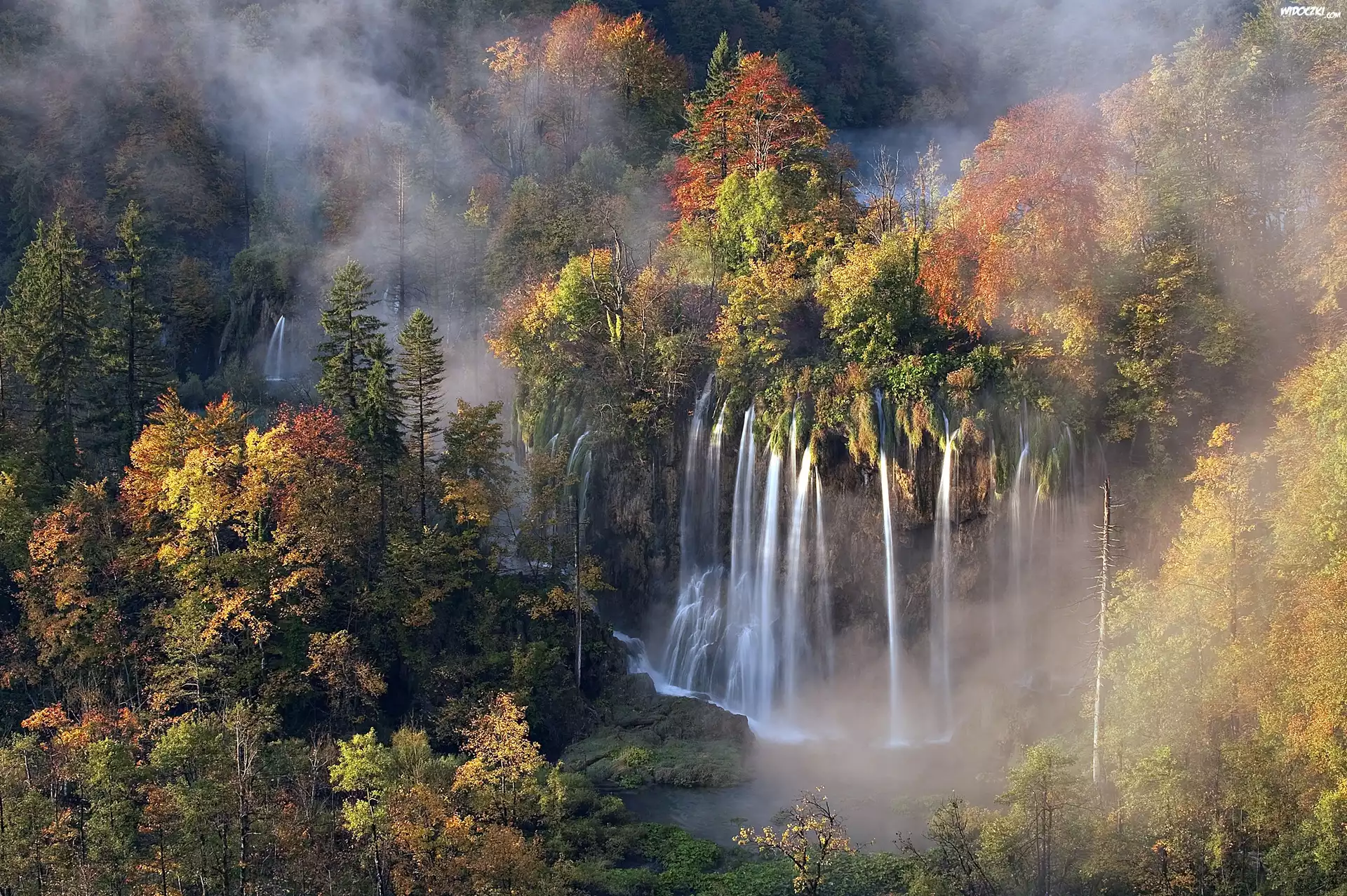 Zdjęcia, Jesień, Las, Mgła, Wodospad