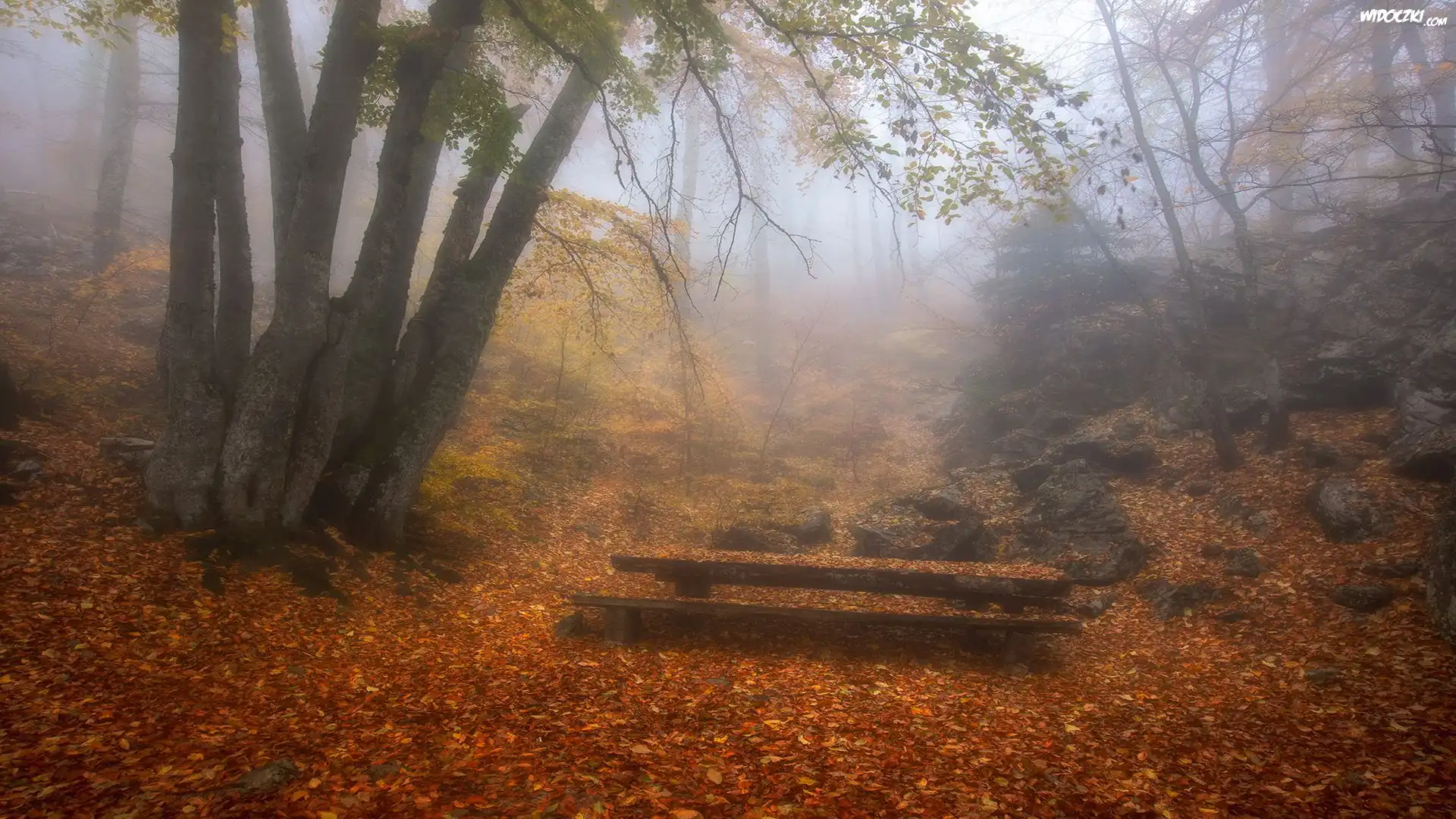 Zdjęcia, Jesień, Drzewa, Liście, Mgła, Ławeczka