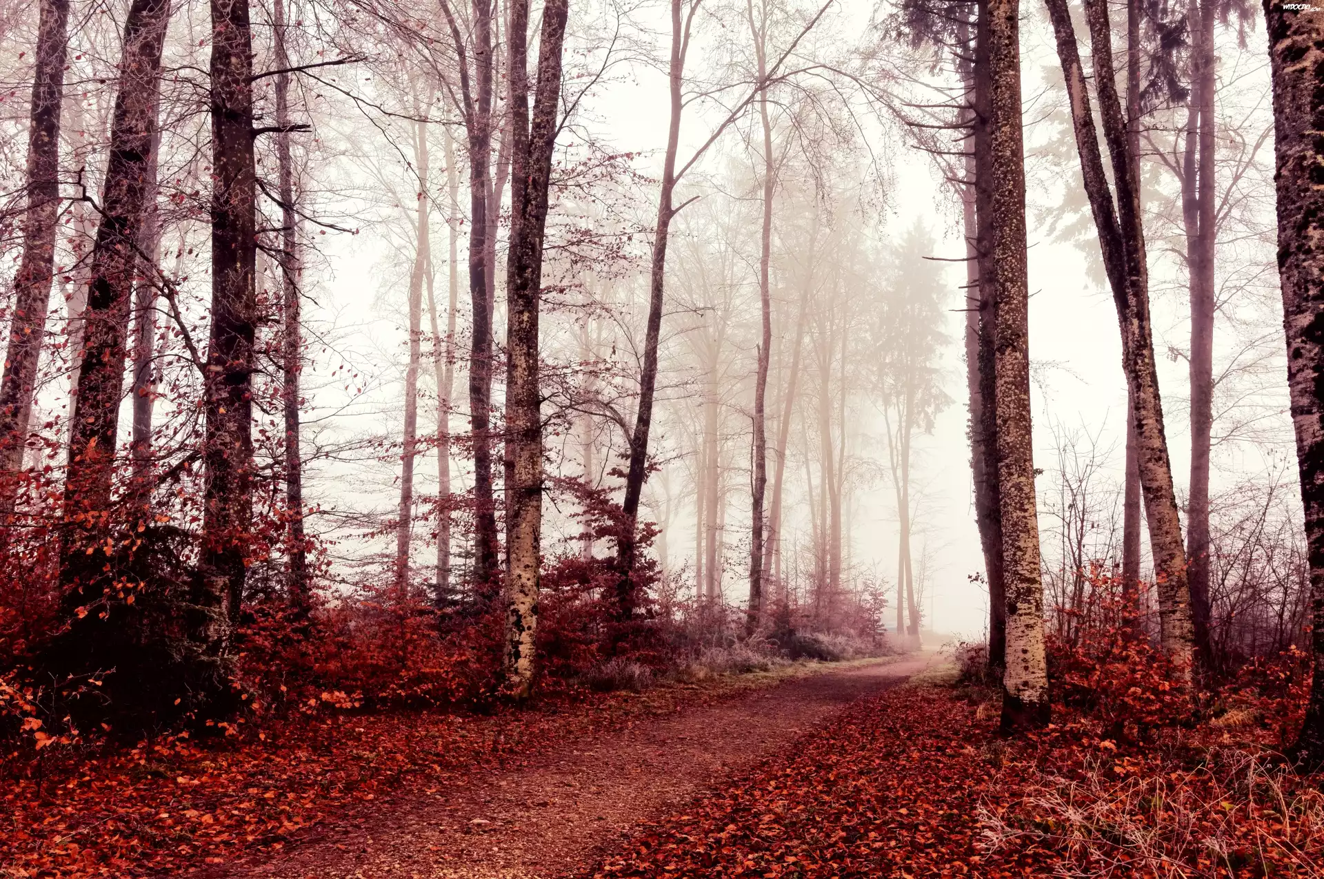 Zdjęcia, Jesień, Drzewa, Liście, Mgła, Ścieżka