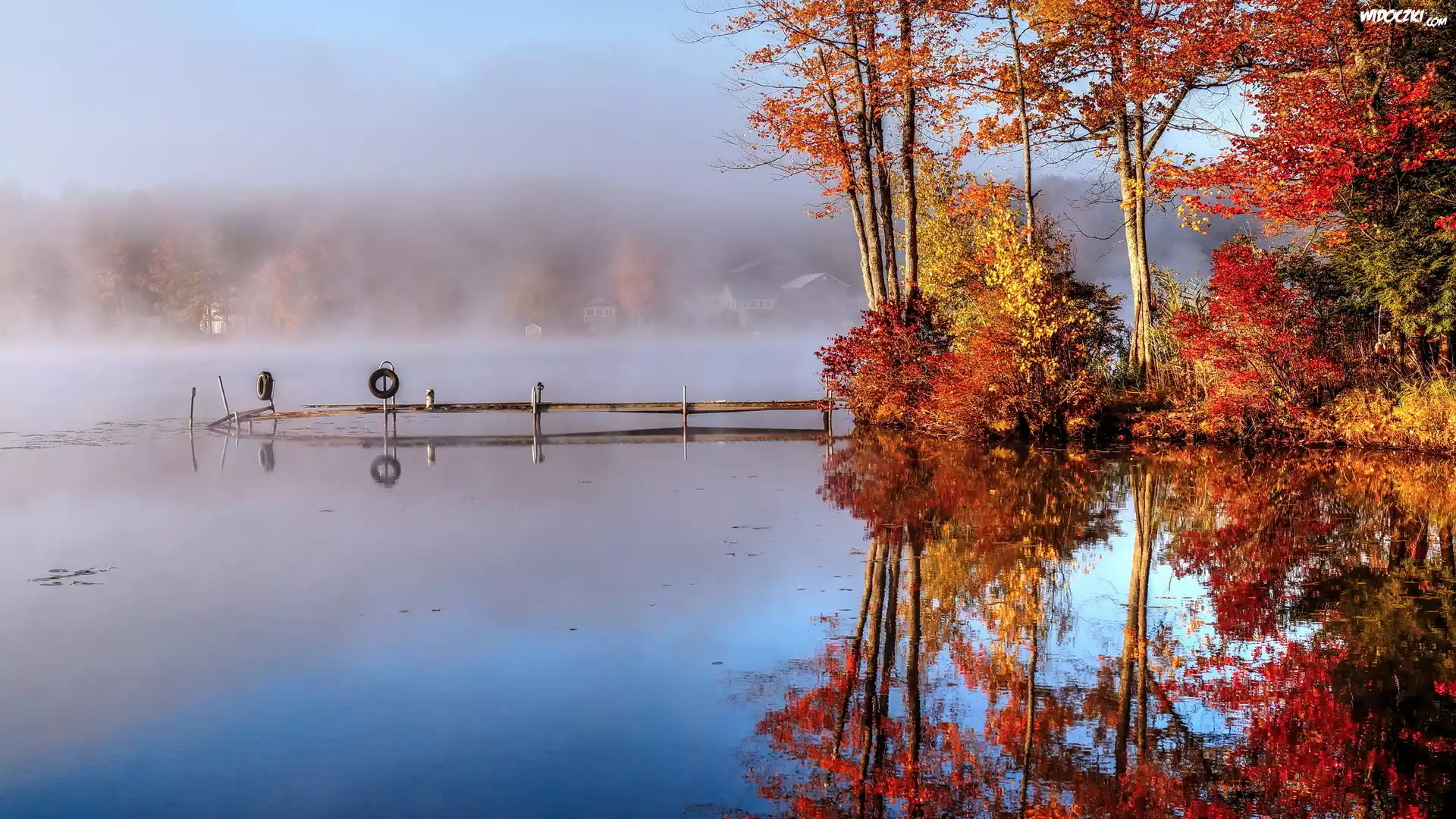 Jesień, Jezioro, Pomost, Mgła, Drzewa