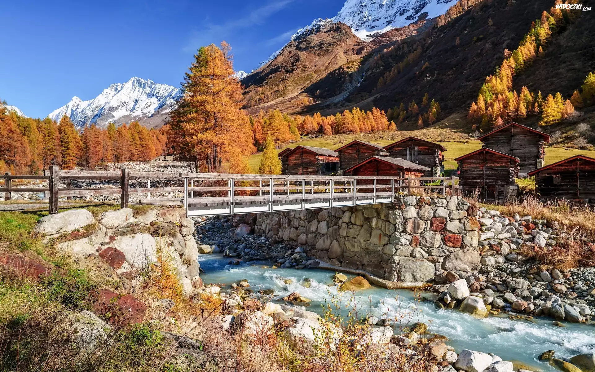 Zdjęcia, Góry, Rzeka, Most, Jesień, Drzewa, Domy, Drewniane