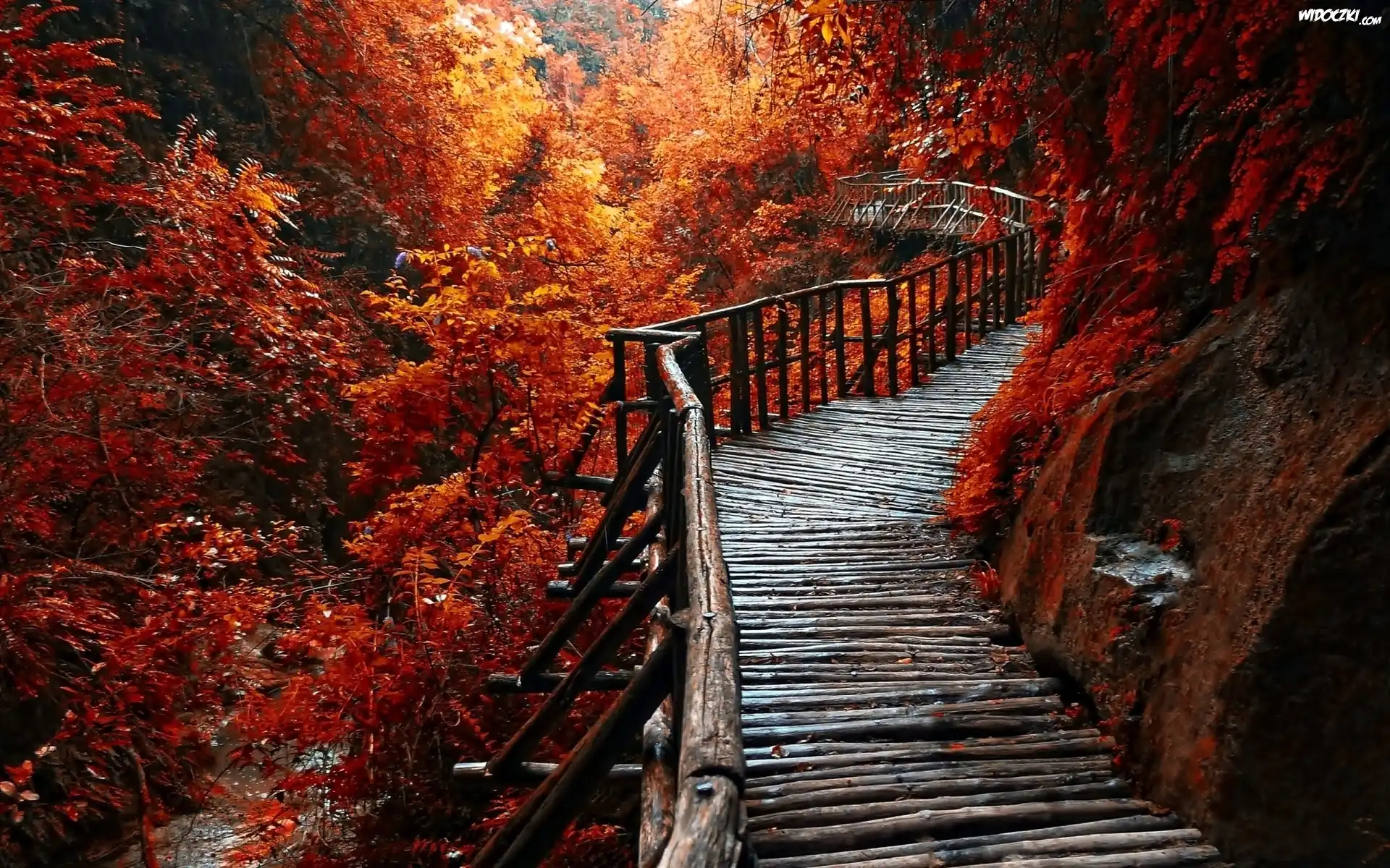 Zdjęcia, Jesień, Drzewa, Rzeka, Kanion, Mostek, Góry