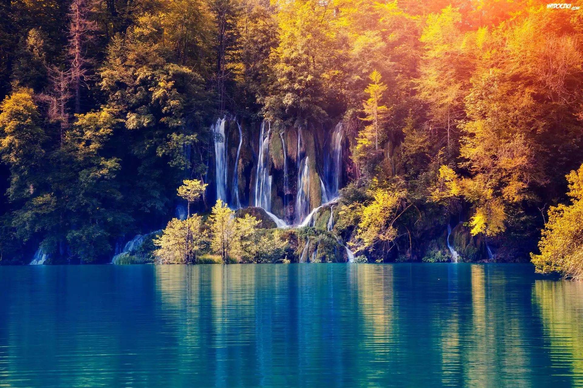 Zdjęcia, Chorwacja, Park Narodowy Jezior Plitwickich, Jezioro, Wodospad, Drzewa, Jesień