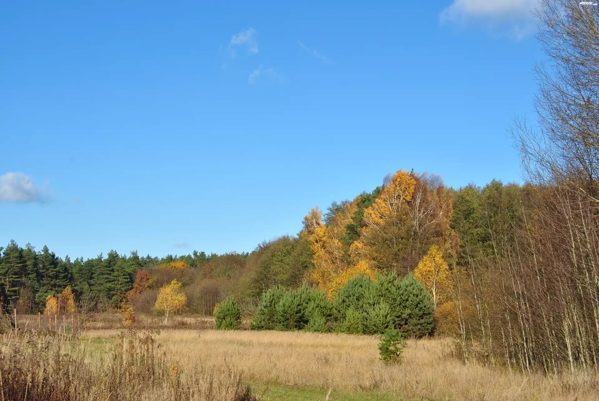 Jesień, Drzewa, Niebo, Łąka