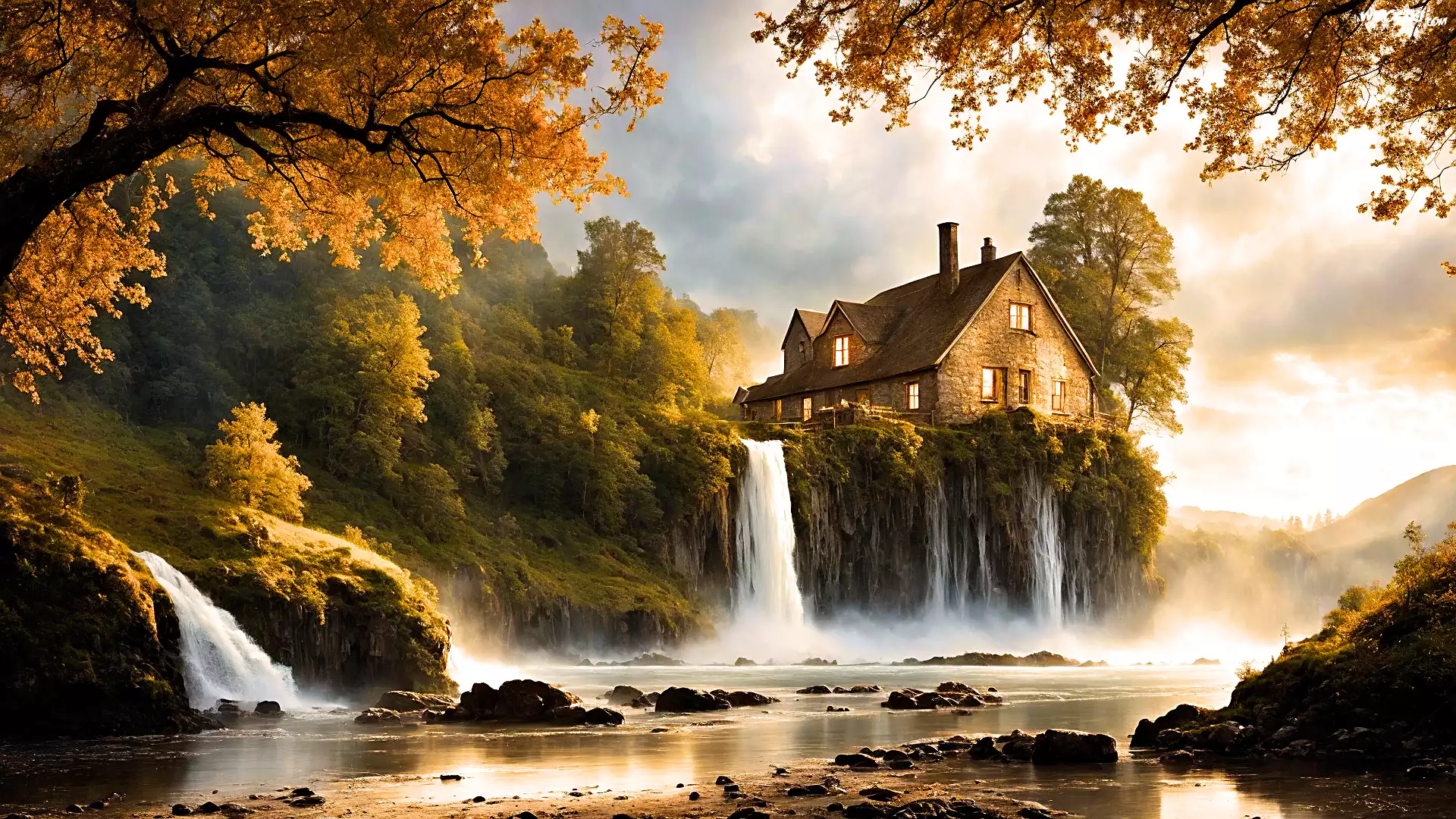 Jesień, Wzgórze, Las, Drzewa, Wodospady, Dom, Rzeka, Kamienie, Niebo, Chmury