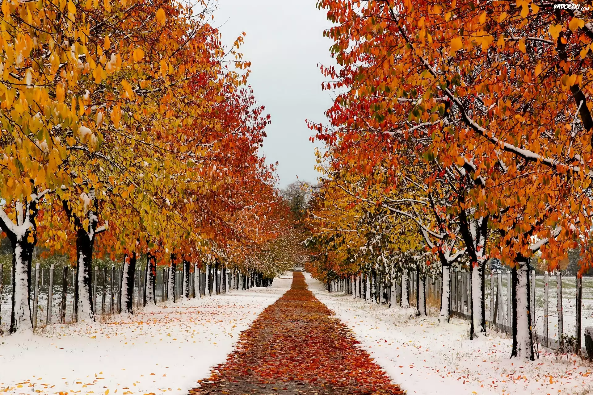 Zdjęcia, Jesień, Żółte, Liście, Drzewa, Śnieg, Droga