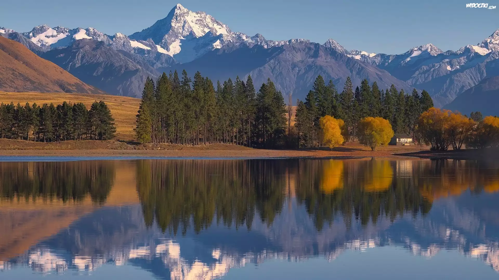 Zdjęcia, Jesień, Góry, Jezioro, Lake Camp, Drzewa, Odbicie, Dom, Nowa Zelandia
