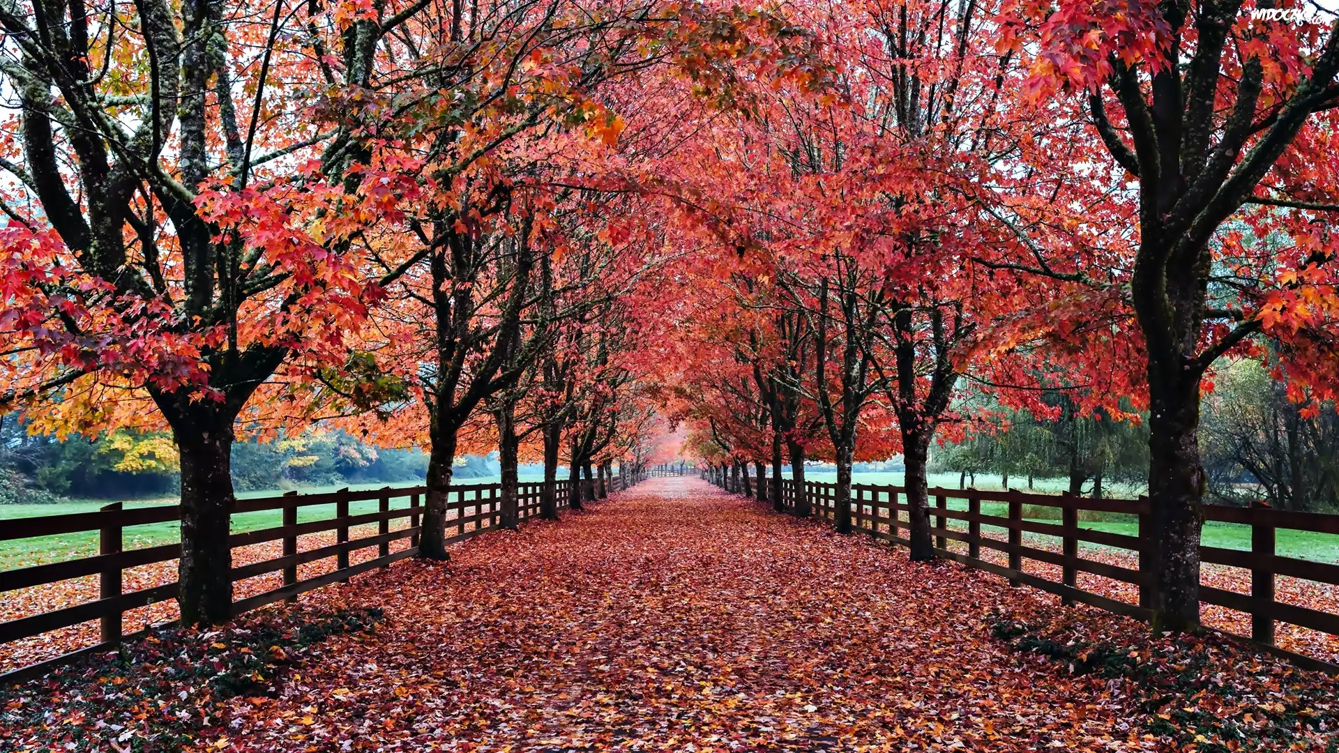 Jesień, Park, Aleja, Drzewa, Ogrodzenie, Liście