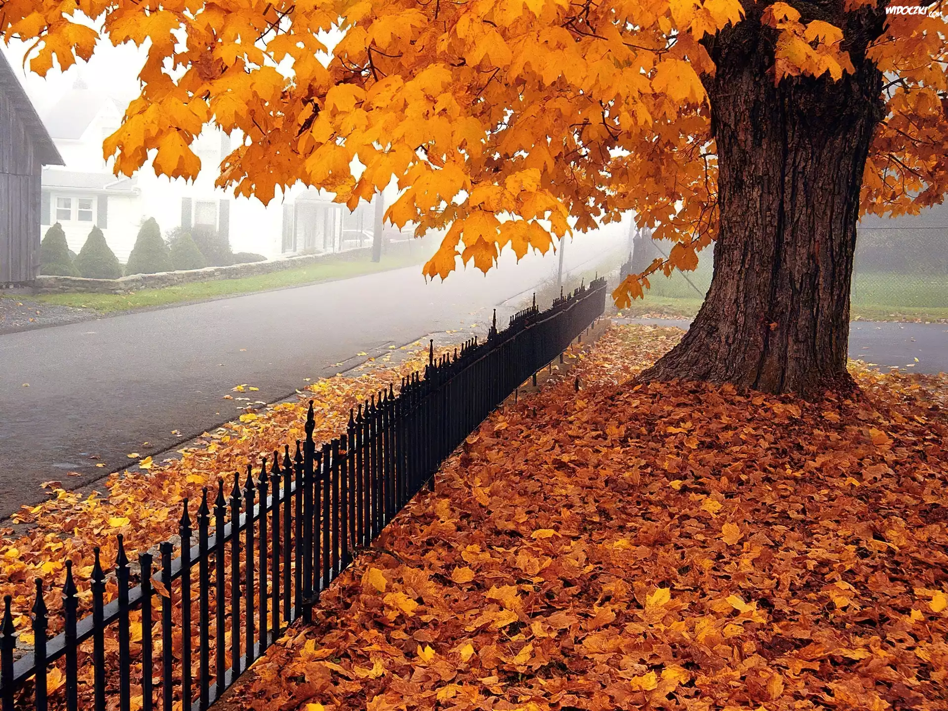 Zdjęcia, Jesień, Żółte, Liście, Drzewo, Ogrodzenie, Ulica