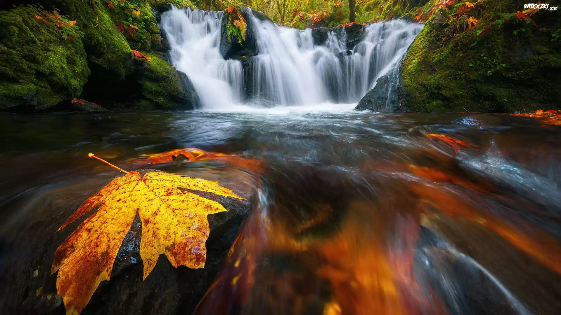 Jesień, Wodospad, Liście, Omszałe, Skały