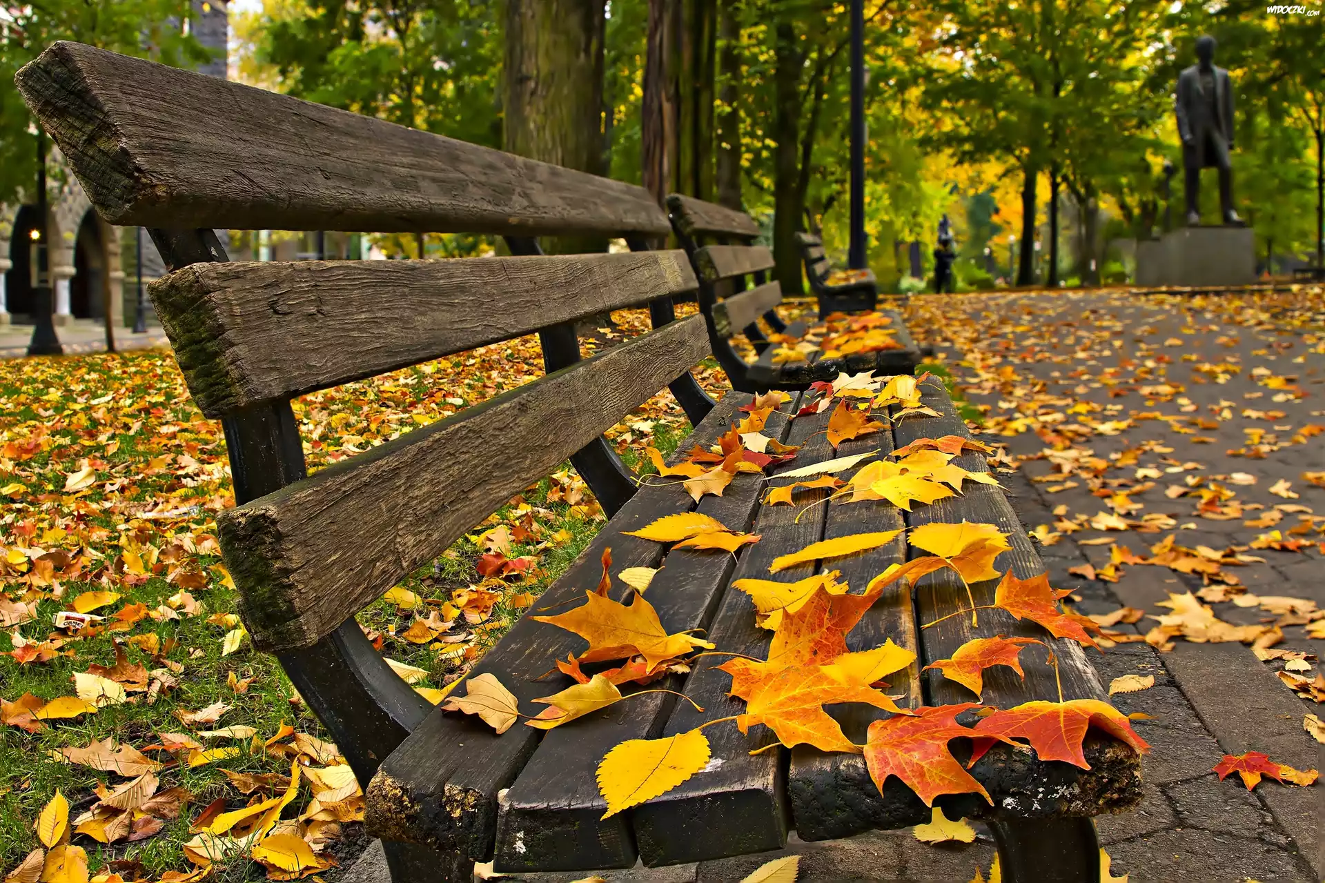 Zdjęcia, Jesień, Park, Ławeczki, Opadłe, Liście