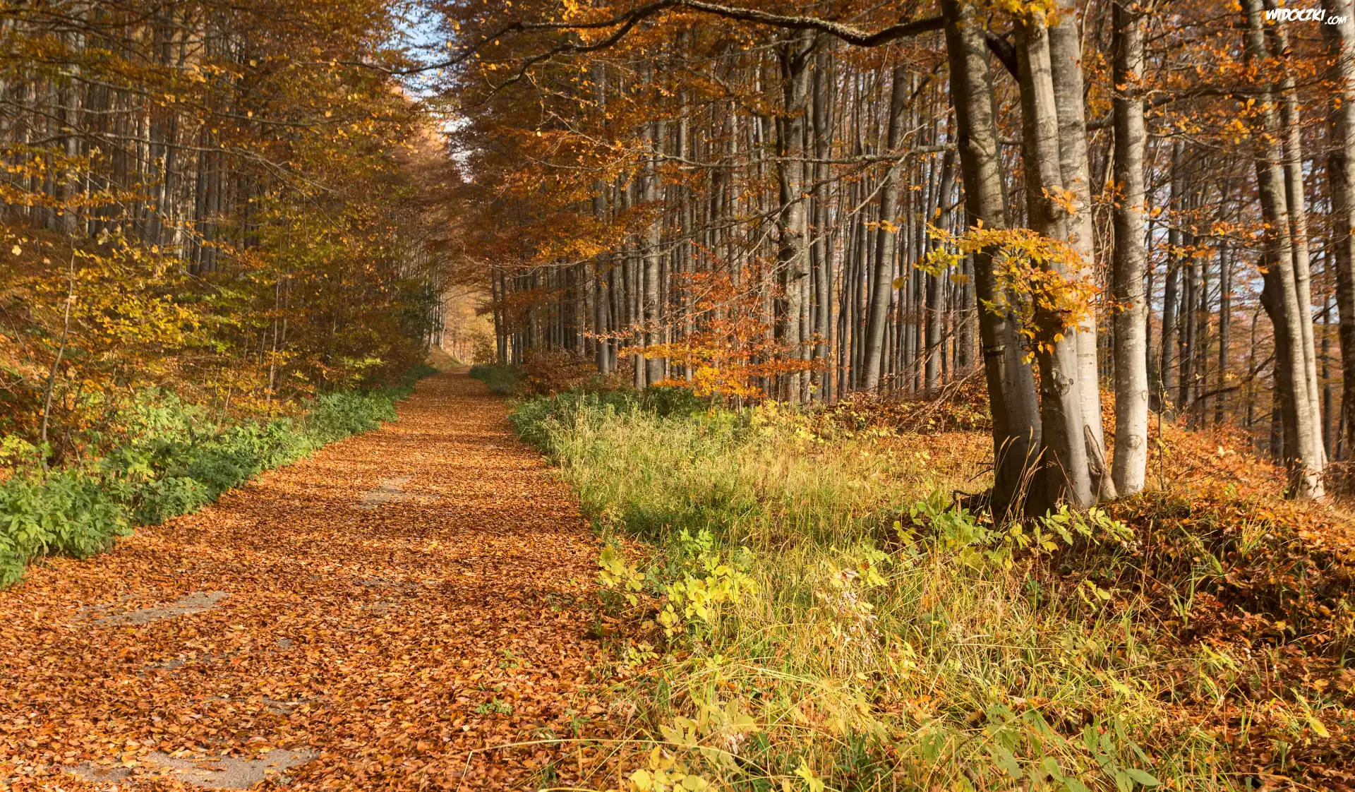 Zdjęcia, Jesień, Las, Drzewa, Droga, Opadłe, Liście