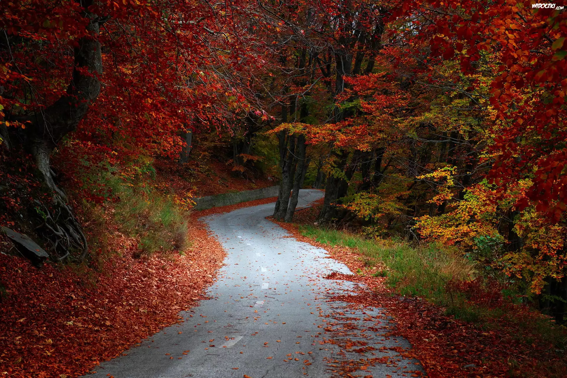Zdjęcia, Jesień, Droga, Drzewa, Las, Opadłe, Liście