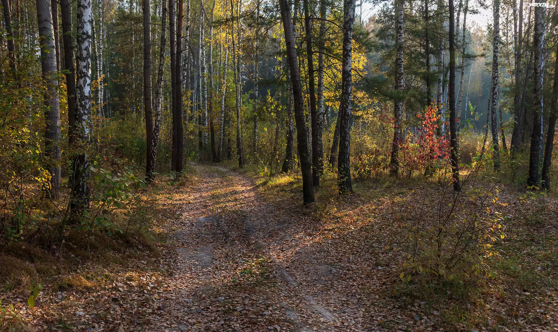 Zdjęcia, Jesień, Drzewa, Las, Droga, Opadłe, Liście