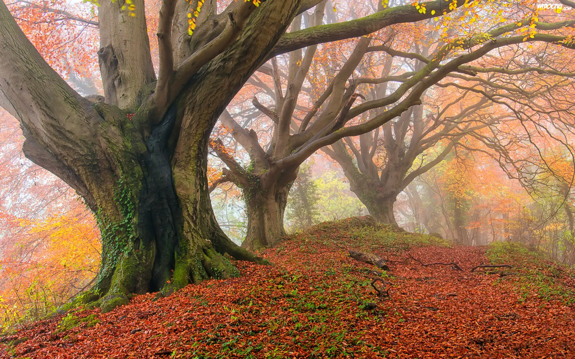 Jesień, Las, Mgła, Drzewa, Opadłe, Liście