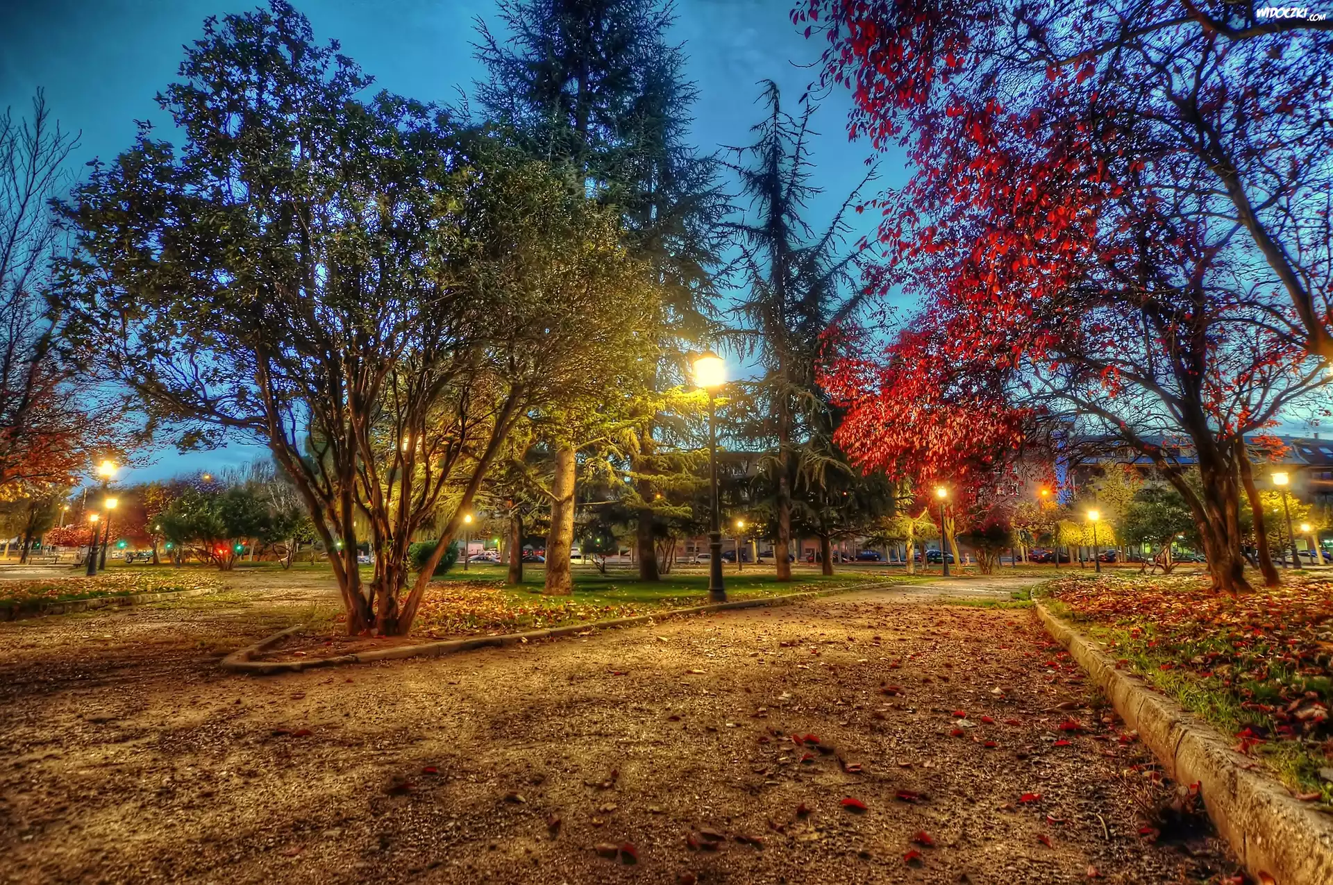 Jesień, Park, Oświetlone, Alejki, Opadłe, Liście