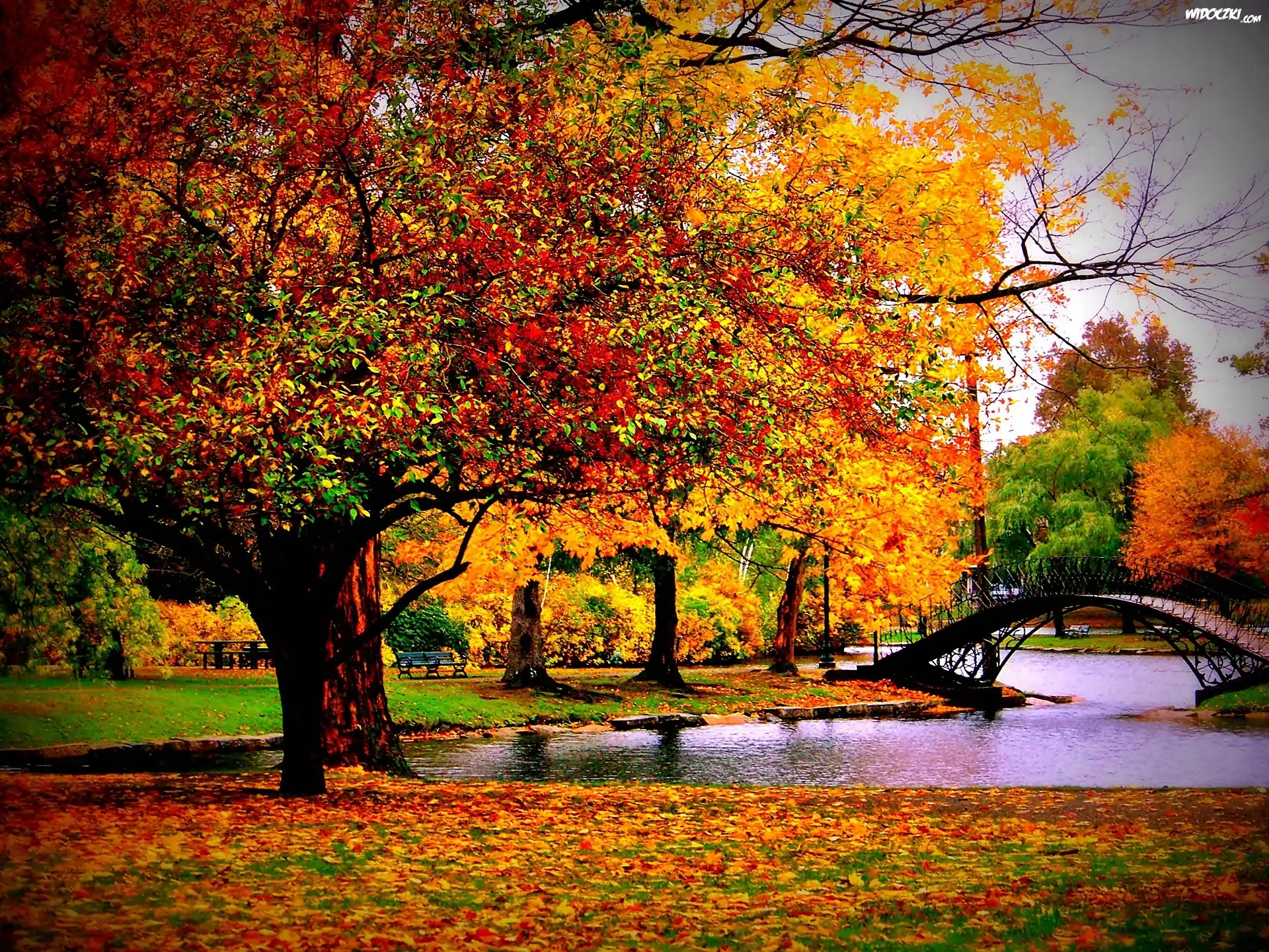 Jesień, Park, Staw, Mostek, Opadłe, Liście