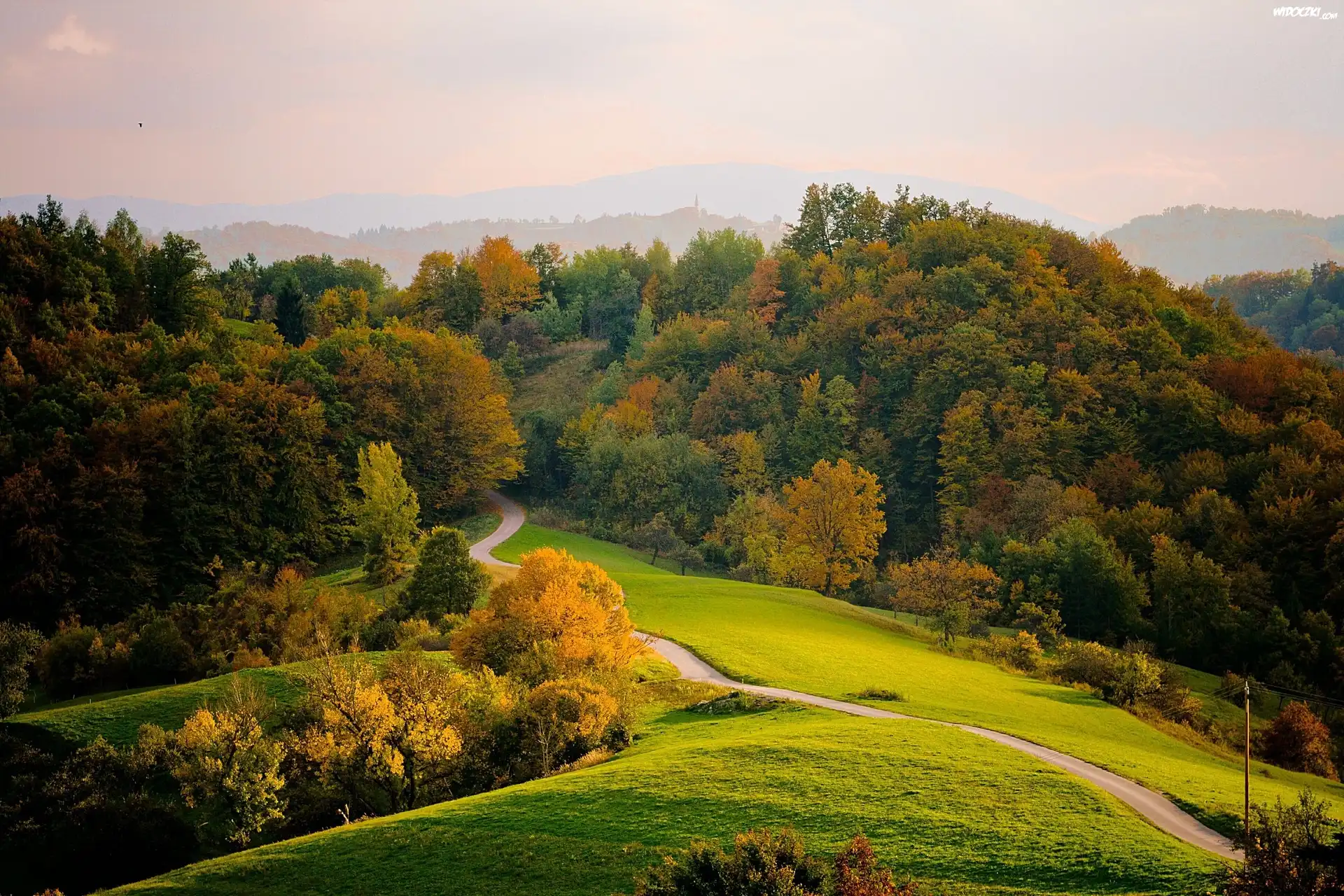 Zdjęcia, Jesień, Droga, Drzewa, Pagórki, Krajobraz