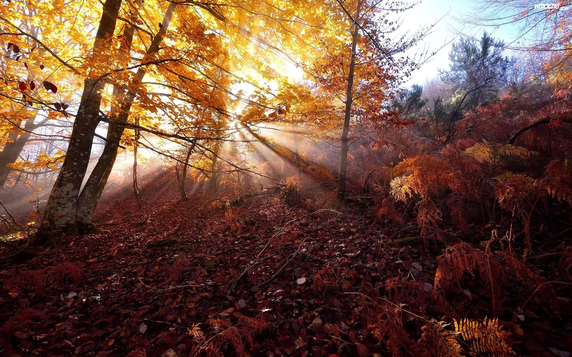 Jesień, Promienie Słońca, Drzewo, Paprocie, Liście