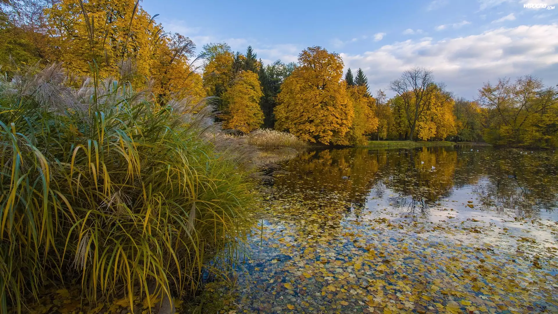 Zdjęcia, Polska, Warszawa, Park, Łazienki Królewskie, Staw, Drzewa, Liście, Jesień