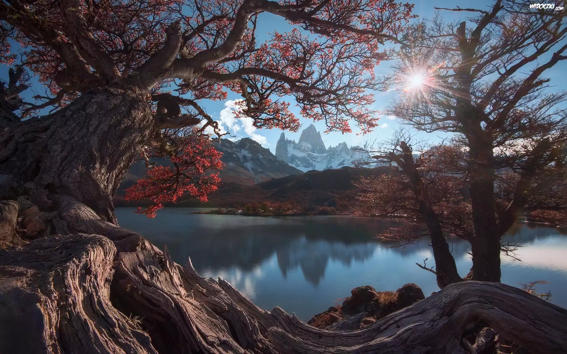 Jesień, Góry Andy, Góra, Fitz Roy, Park Narodowy Los Glaciares, Drzewa, Gałęzie, Promienie słońca, Patagonia, Argentyna |