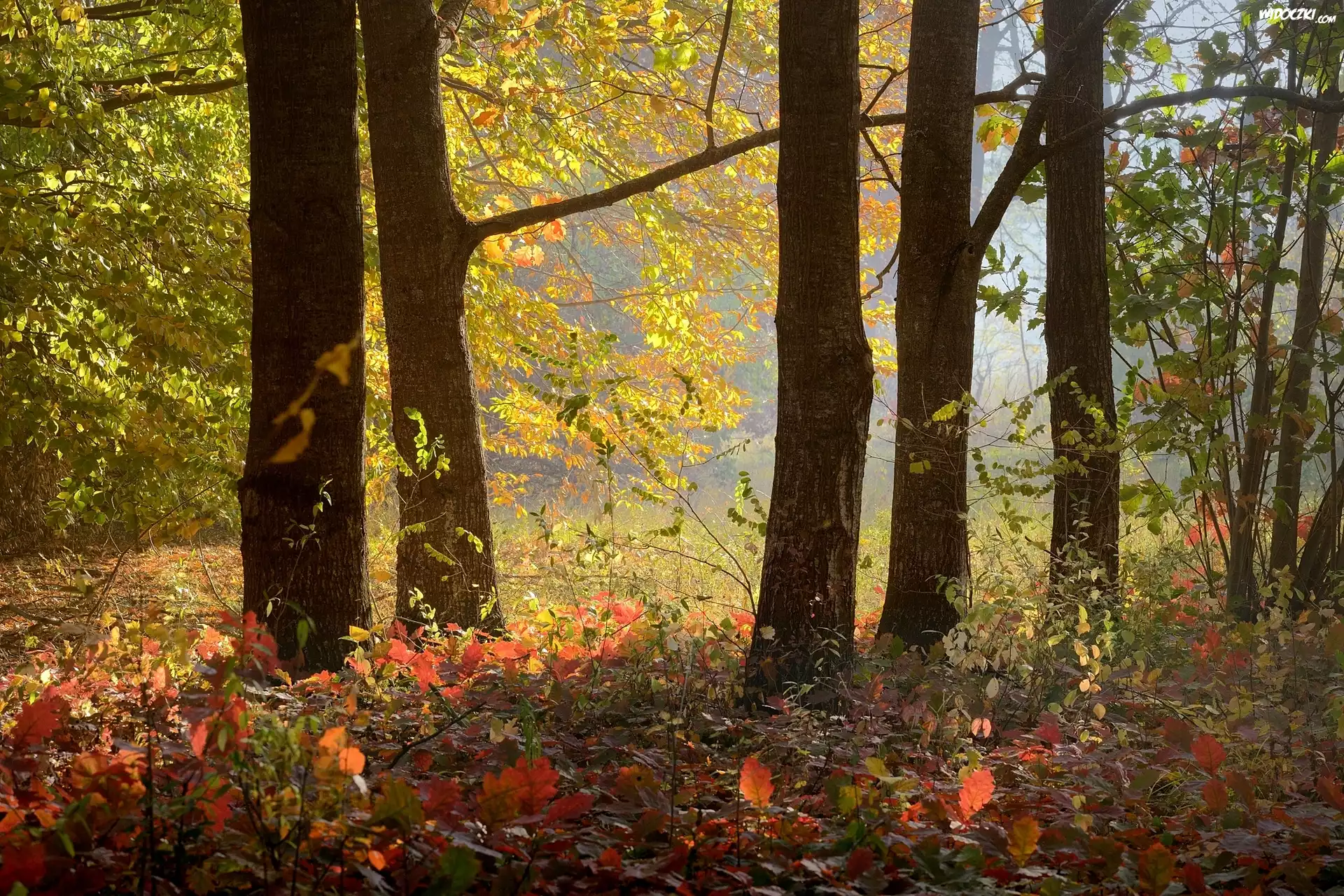 Zdjęcia, Jesień, Las, Kolorowe, Liście, Pnie, Drzewa