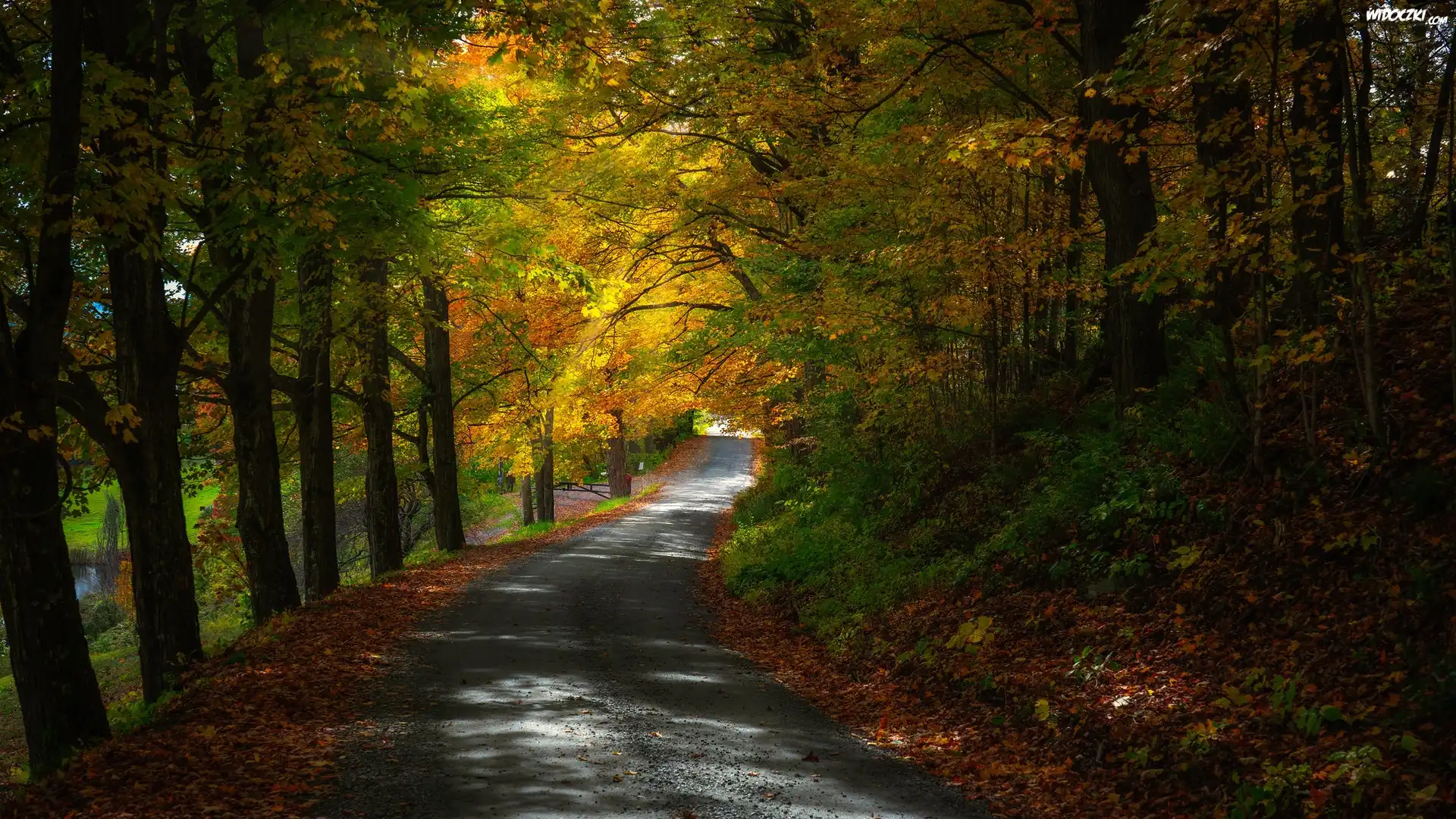 Jesień, Las, Droga, Pożółkłe, Drzewa