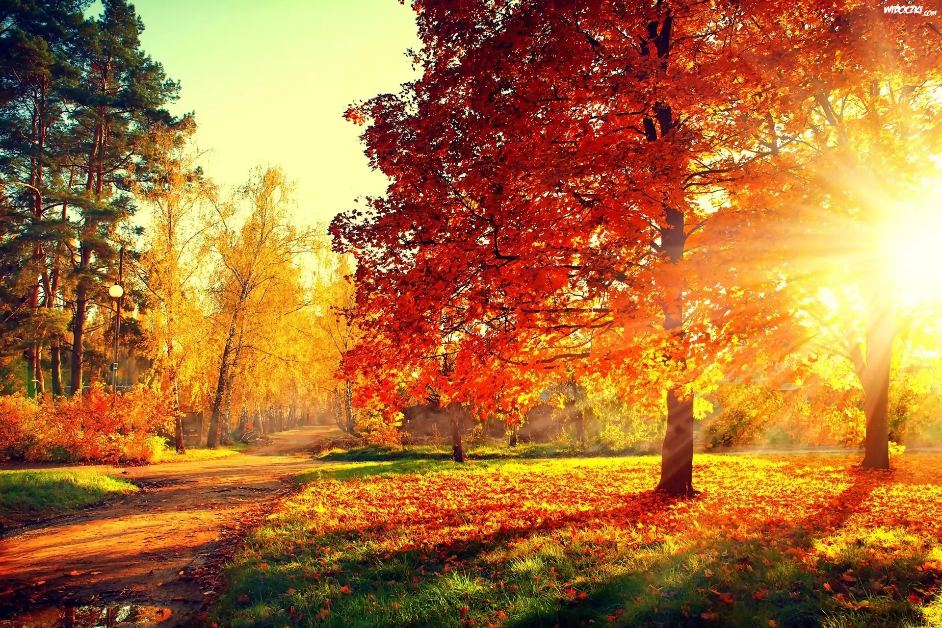 Jesień, Park, Aleja, Drzewa, Promienie Słońca