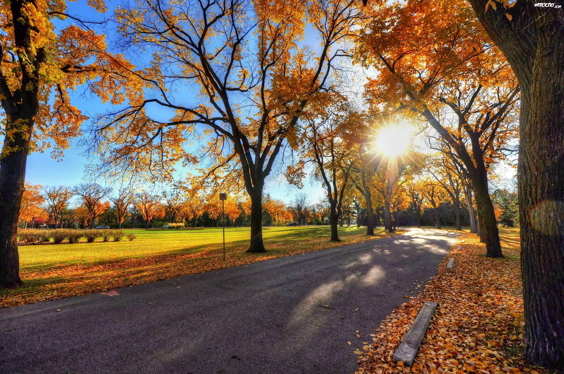Zdjęcia, Jesień, Park, Aleja, Promienie Słońca
