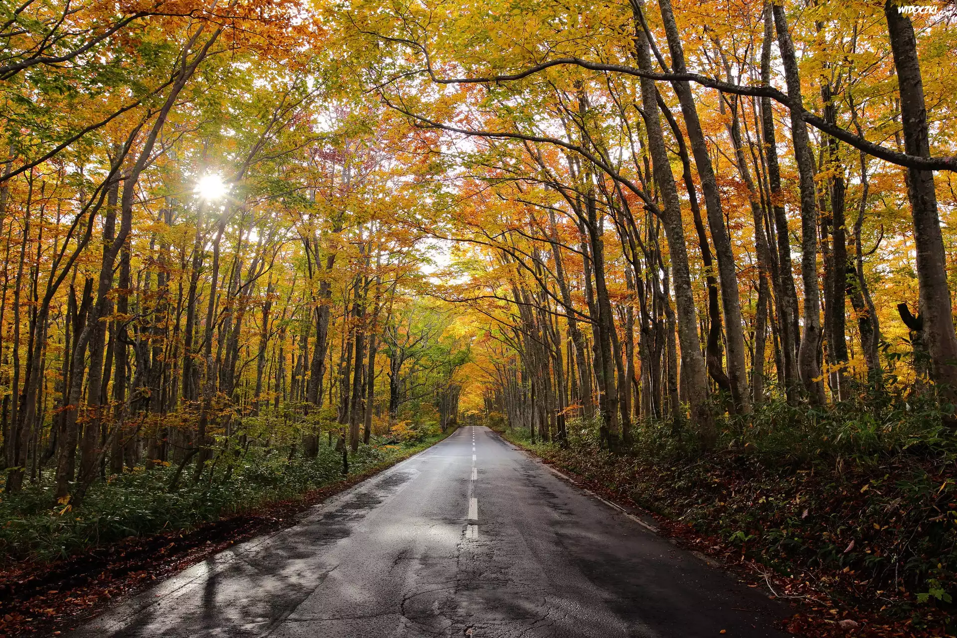 Jesień, Las, Drzewa, Droga, Promienie słońca