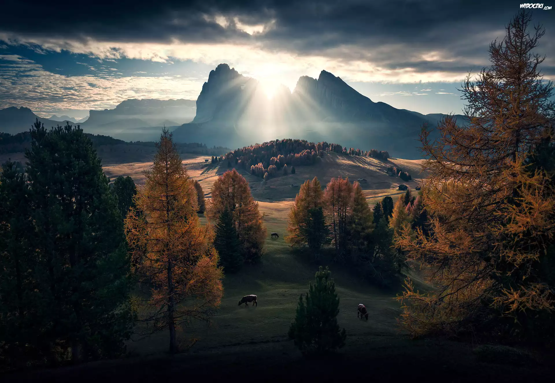 Jesień, Wzgórza, Drzewa, Góry, Promienie słońca