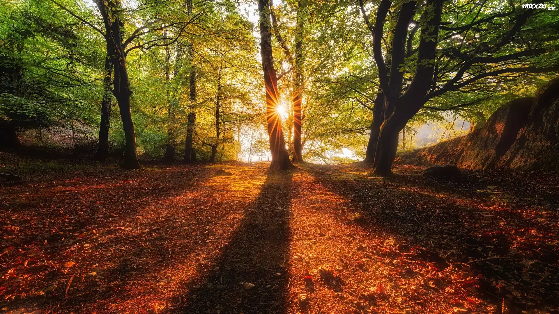 Jesień, Las, Drzewa, Promienie słońca