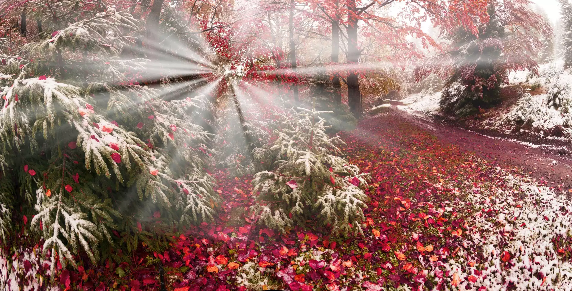 Jesień, Śnieg, Las, Drzewa, Promienie słońca