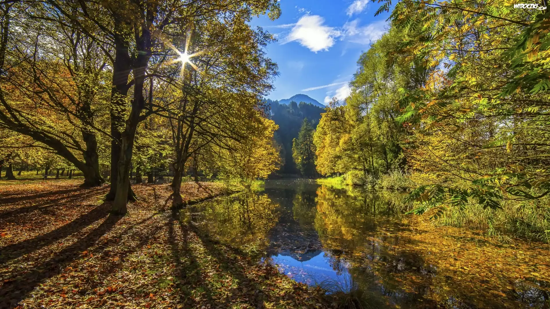 Jesień, Drzewa, Rzeka, Promienie słońca
