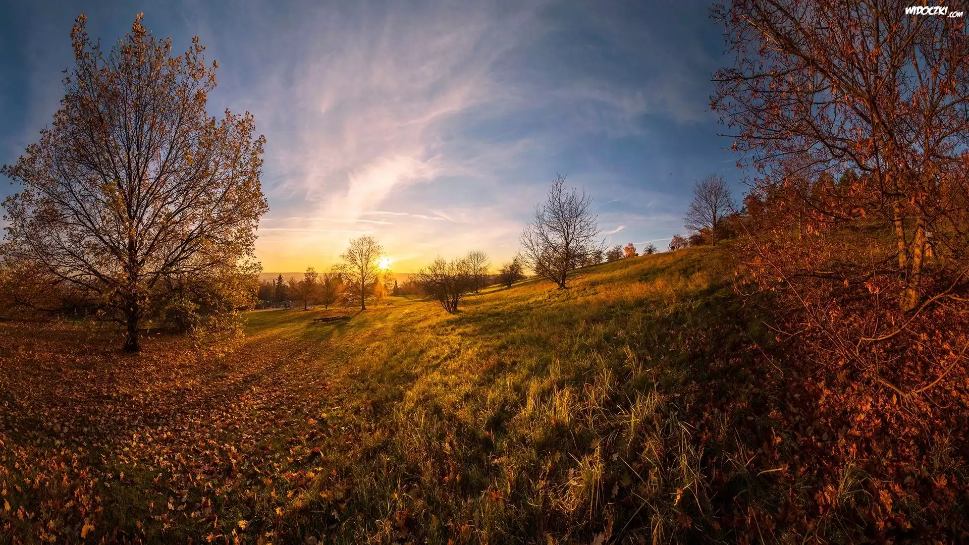 Jesień, Drzewa, Wzgórza, Promienie słońca