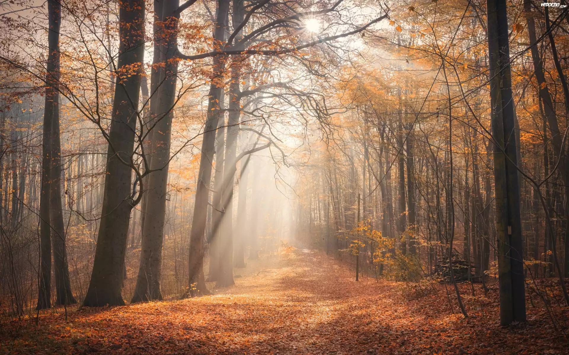 Zdjęcia, Jesień, Las, Drzewa, Przebijające światło