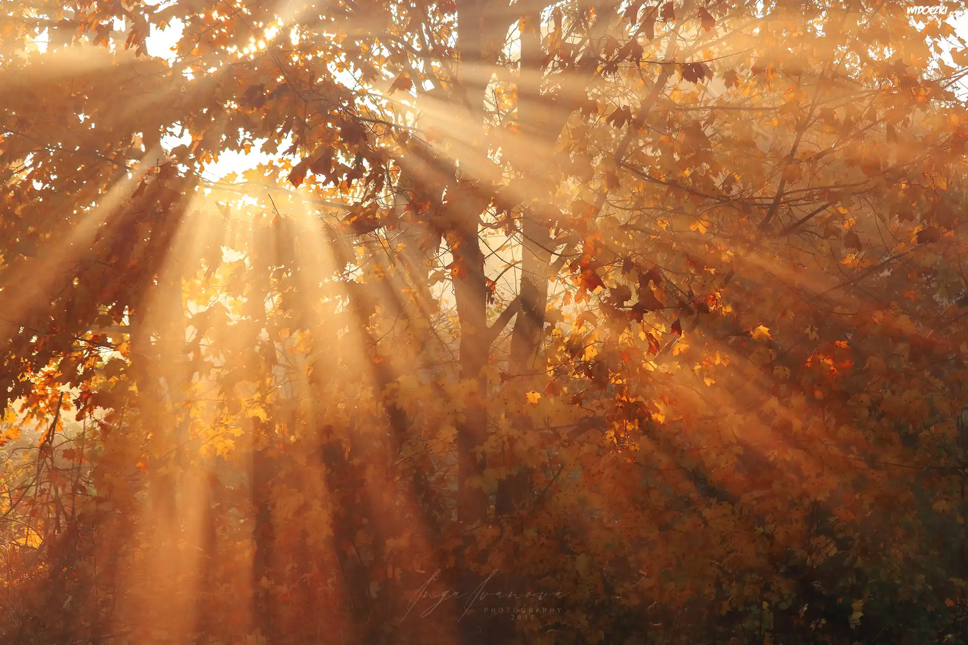 Zdjęcia, Jesień, Las, Drzewa, Liście, Przebijające światło