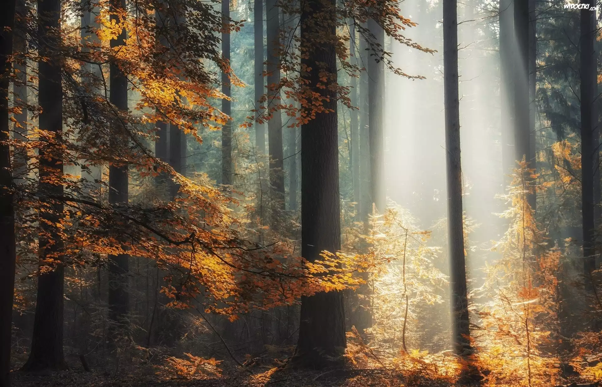 Jesień, Las, Mgła, Przebijające światło