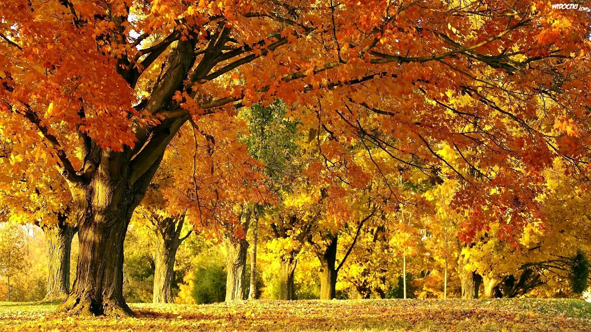 Zdjęcia, Jesień, Park, Opadłe, Liście, Przebijające, Światło