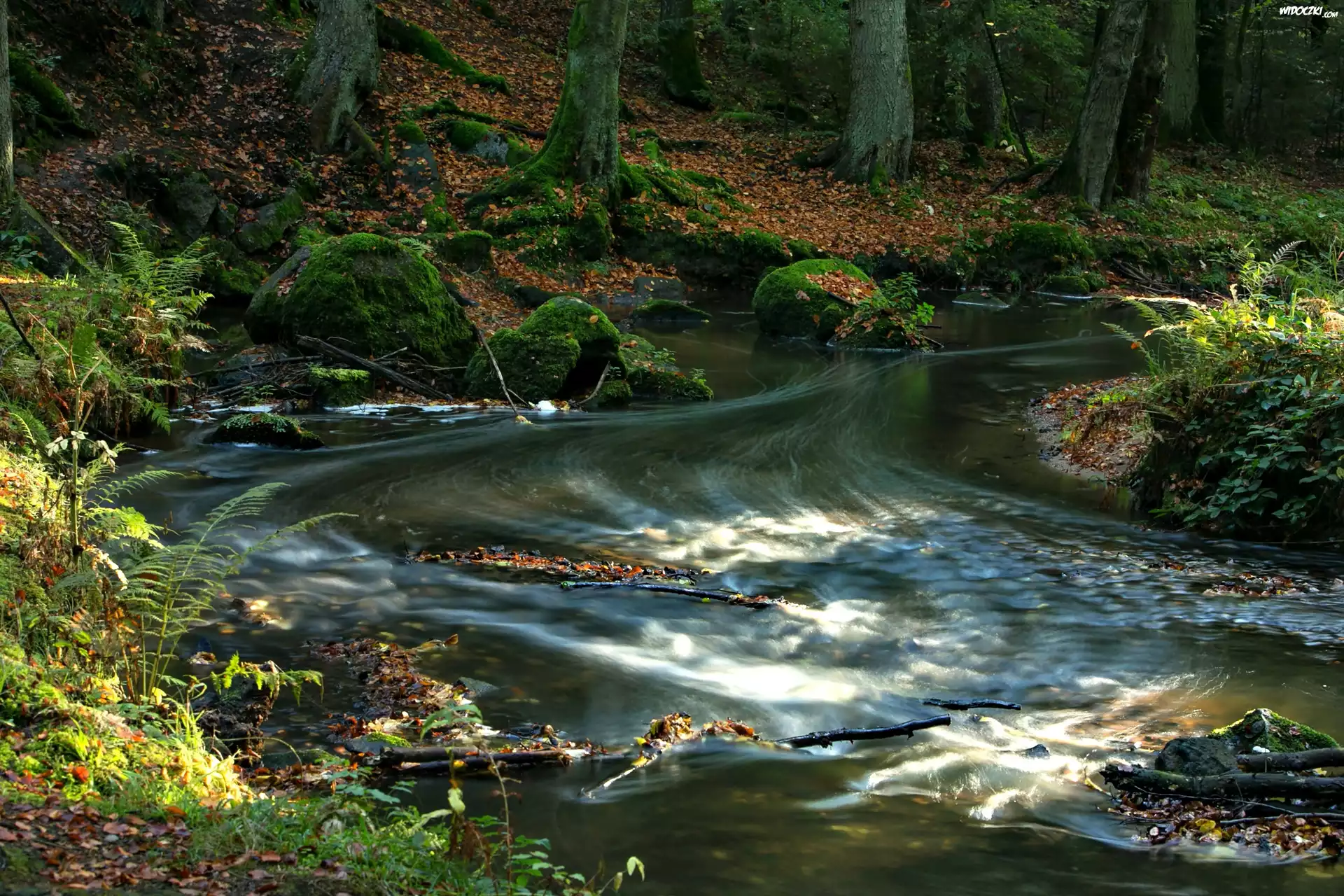 Zdjęcia, Jesień, Las, Rzeka, Przebijające, Światło
