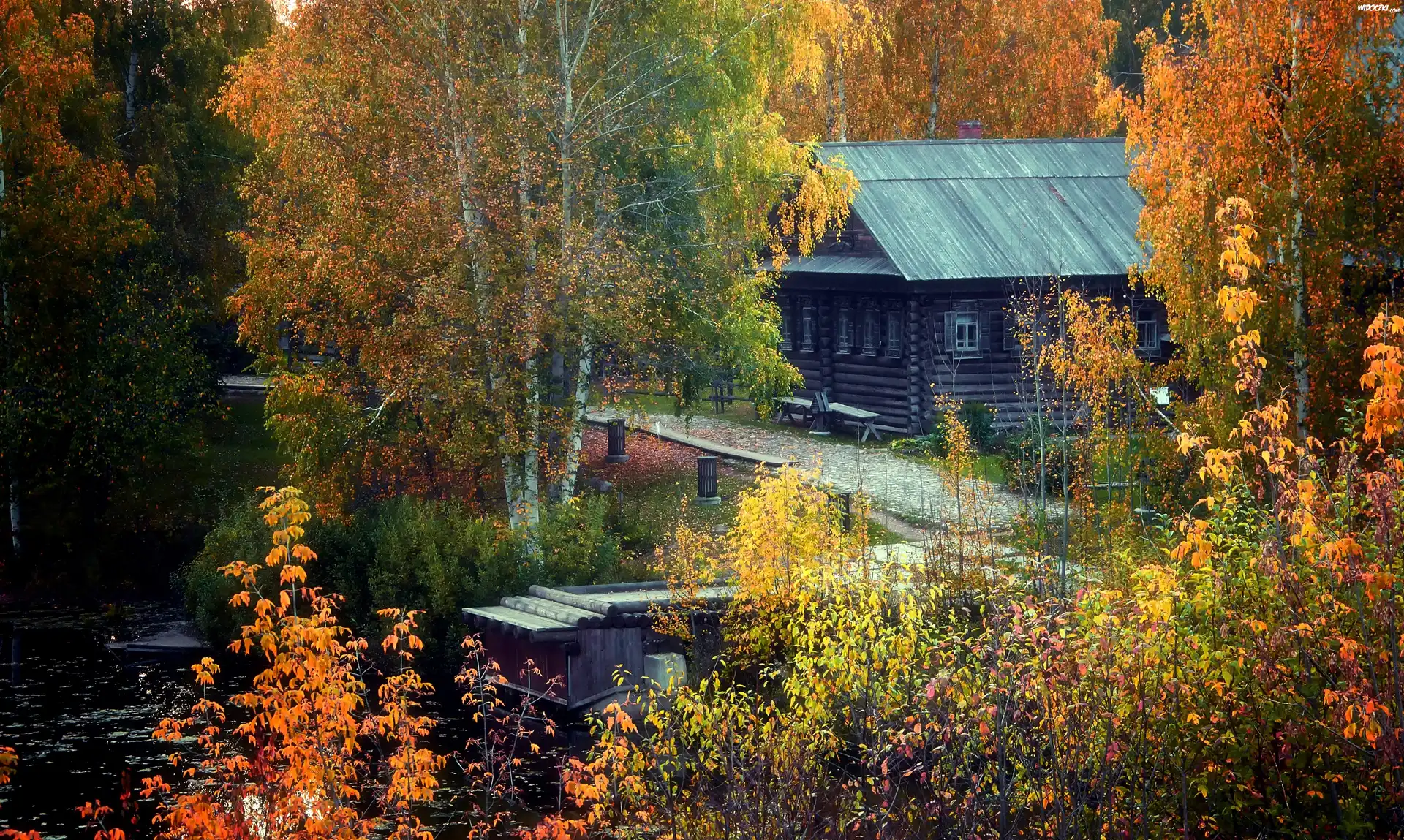 Jesień, Dom, Rzeczka, Drzewa